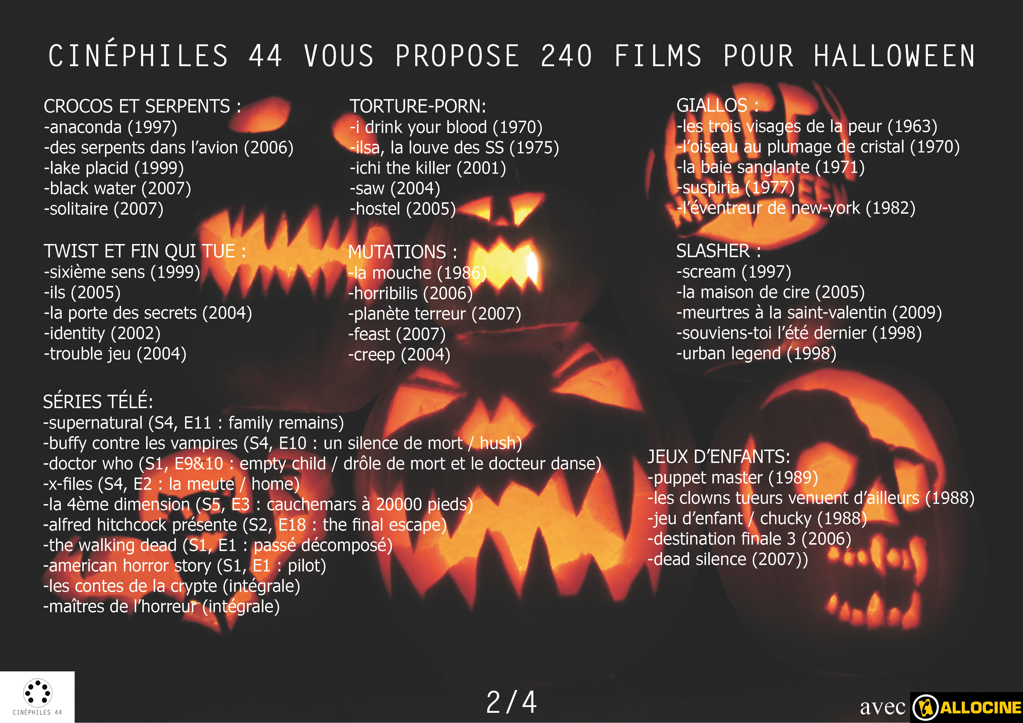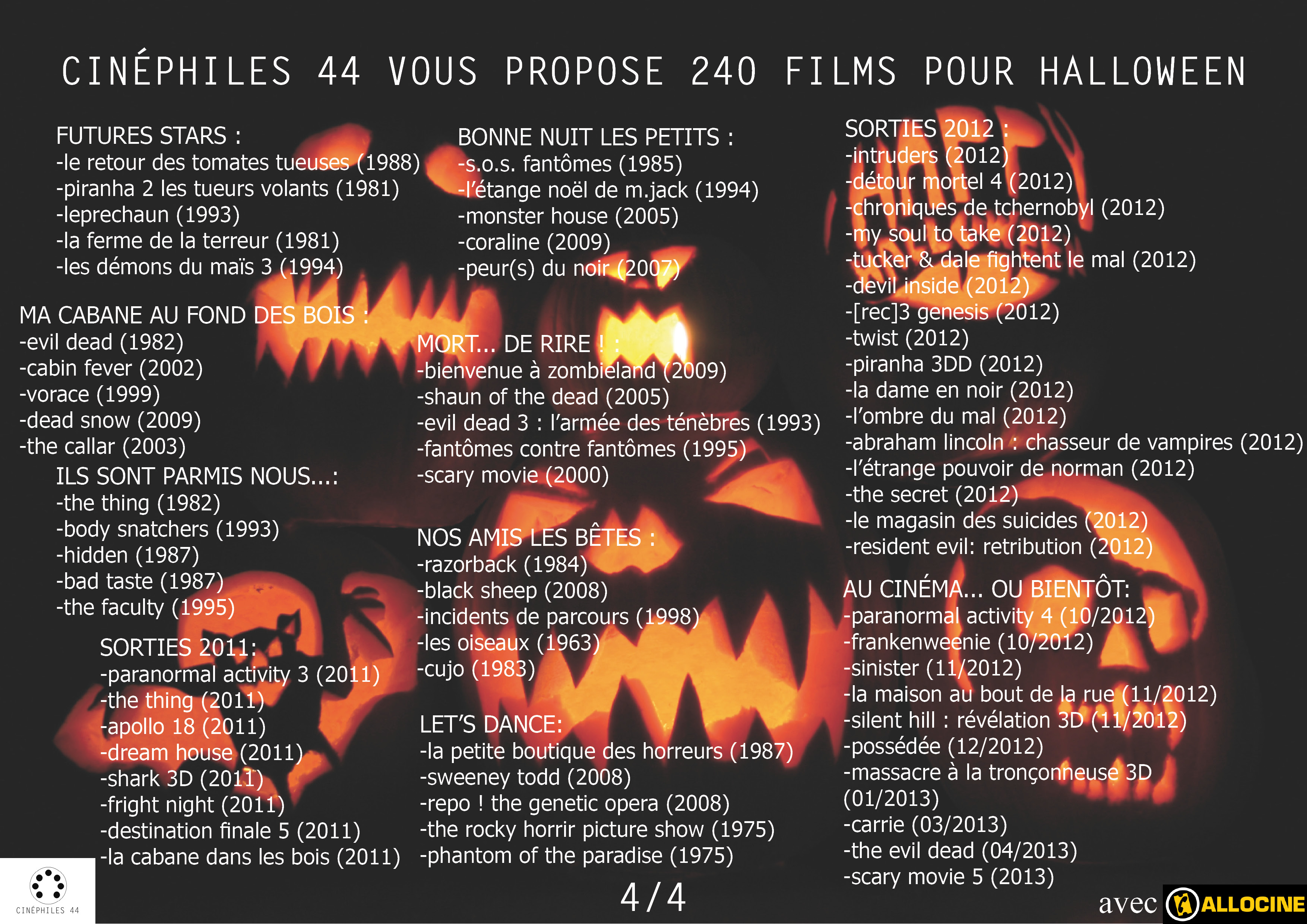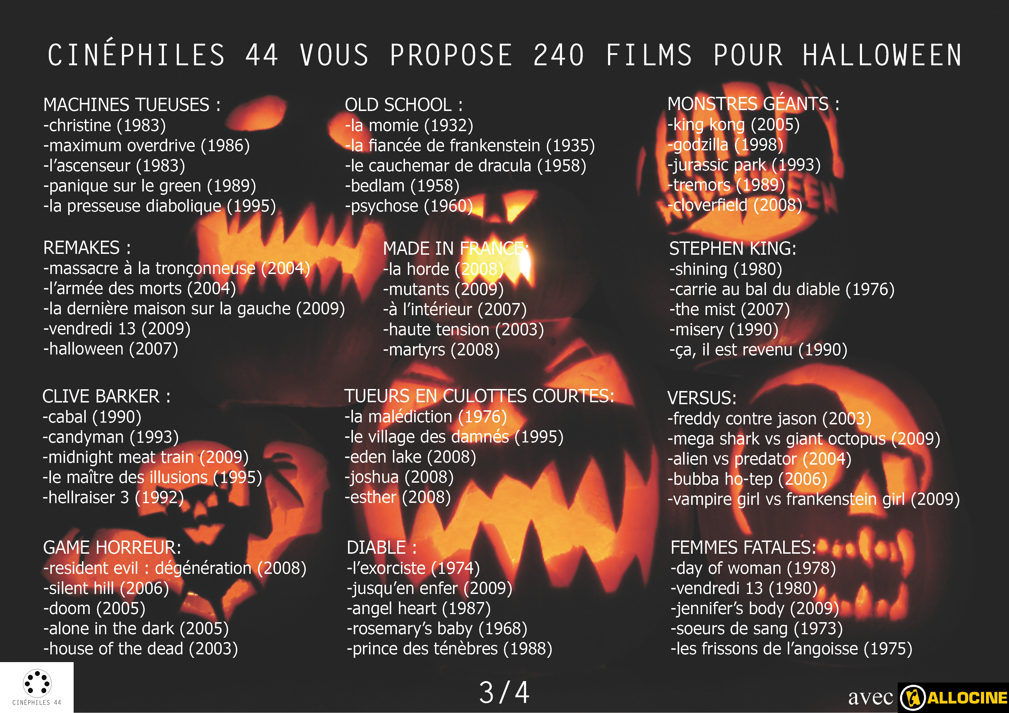 Classements et Elections 240 films pour Halloween Publié par Cinéphiles 44 le 3 novembre 2016 Cinéphiles 44 a sélectionné pour vous, 240 films pour passer un week-end très halloween… Partager : Partager sur X(ouvre dans une nouvelle fenêtre) X Partager sur Facebook(ouvre dans une nouvelle fenêtre) Facebook J’aime chargement… Similaire